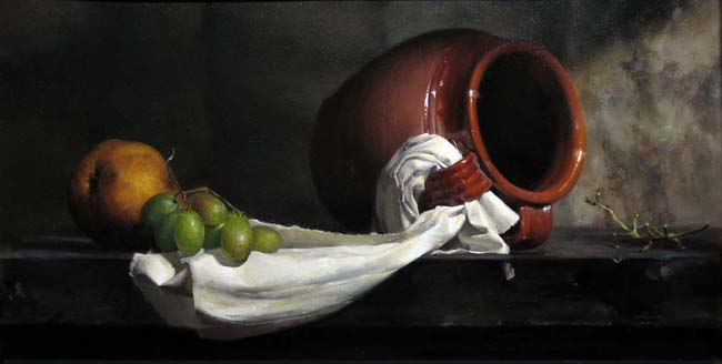 In this course, you will be led through the stages of the painting process in the recreation of a still life of one of the three images of works featured here (also in our “Student Works” website page). Topics to be discussed include: Why are these paintings successful, what pigment mixtures might best match certain colours and how to develop various textures that describe the tactile qualities of the objects portrayed. By the end, you will have produced a still-life painting certain to impress everyone and, more importantly, you will understand the ideas and techniques that construct a strong image. -Ideas and techniques that you can then use to paint your own original artwork!