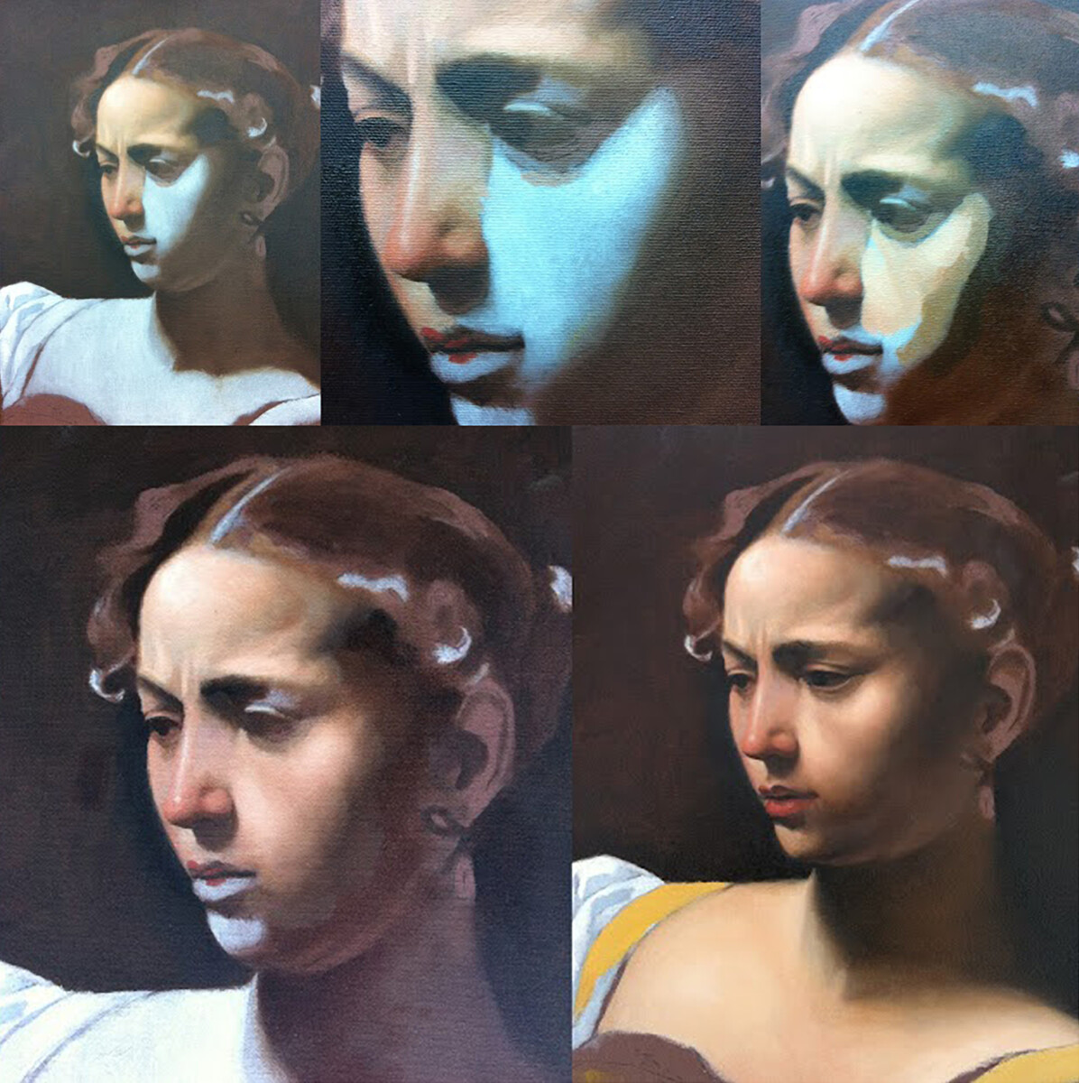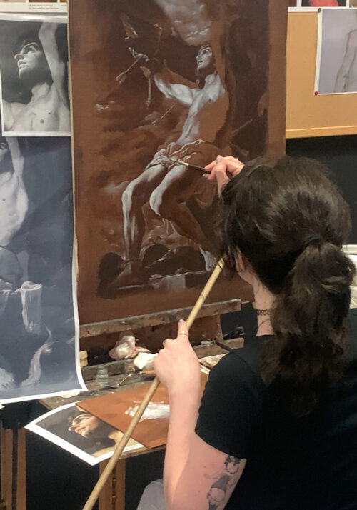 Working from high-resolution prints students will transfer the image to the prepared canvas. From there all stages of Caravaggio’s painting process will be discussed and practiced: Wash drawing, abozzo, over-painting through to the final glazes.
